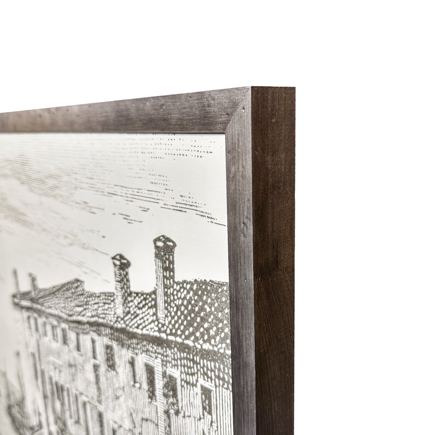 Fine linework in warm sepia tones depicts a historic canal scene, where gondoliers and docked boats create depth and gentle movement across the water’s surface. The detailed architectural facades and calm horizon give the framed piece a timeless European character that complements both traditional and transitional interiors.