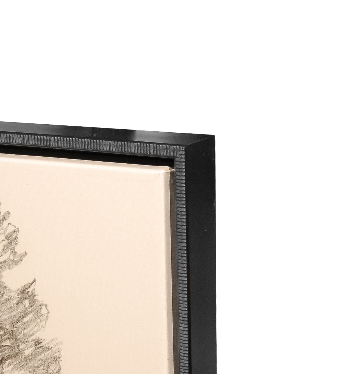 Loose graphite-style strokes outline a gentle riverside landscape, where a solitary tree, low hills, and reflective water create a sense of openness and calm. The minimal composition and monochrome palette give the framed piece a timeless, understated presence that complements both modern and traditional interiors.