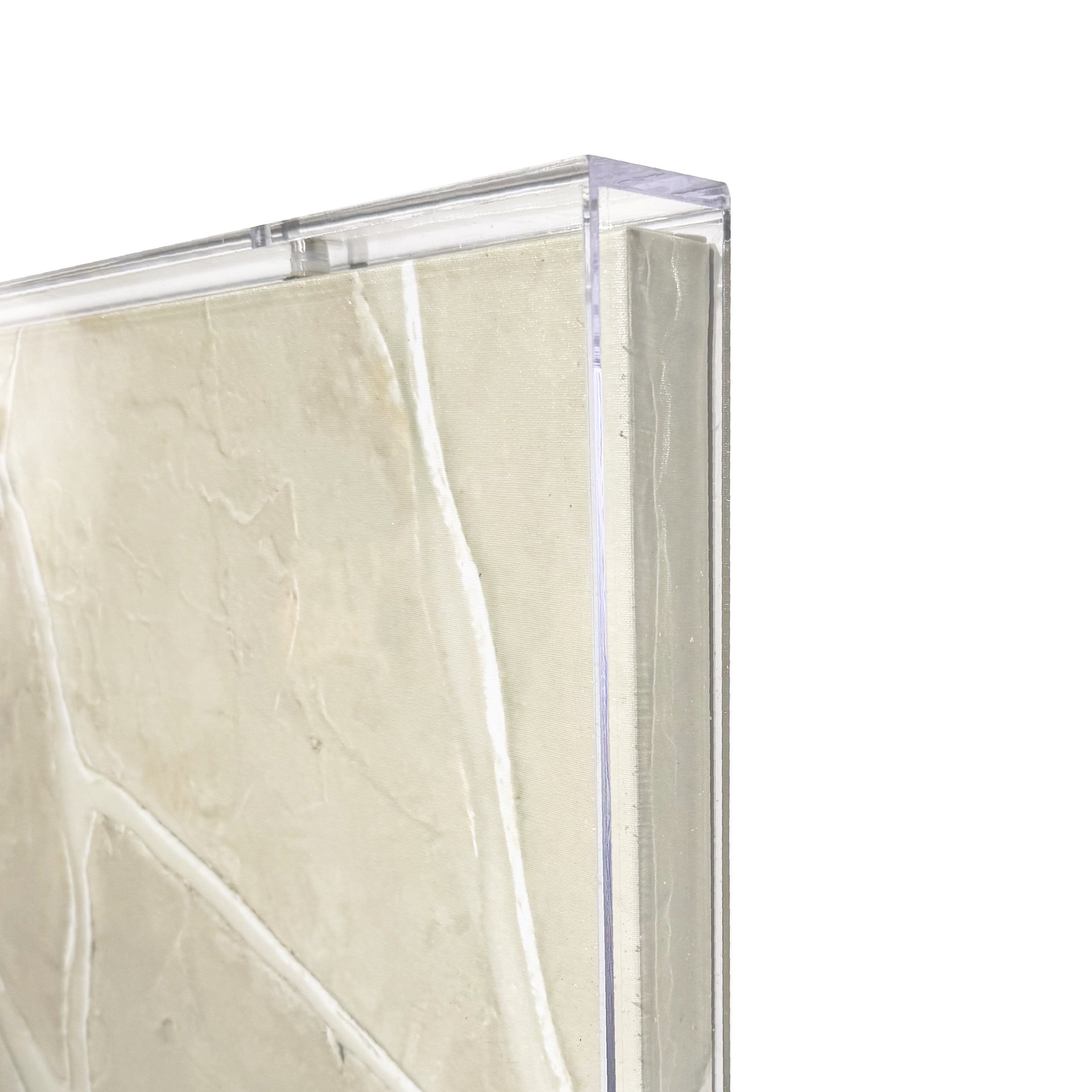 Layered textures form a structured, tactile pattern that introduces warmth and subtle dimension to modern interiors. Printed on premium canvas and presented within a clear acrylic shadowbox, the piece delivers a clean, architectural presence that complements neutral palettes and natural materials.