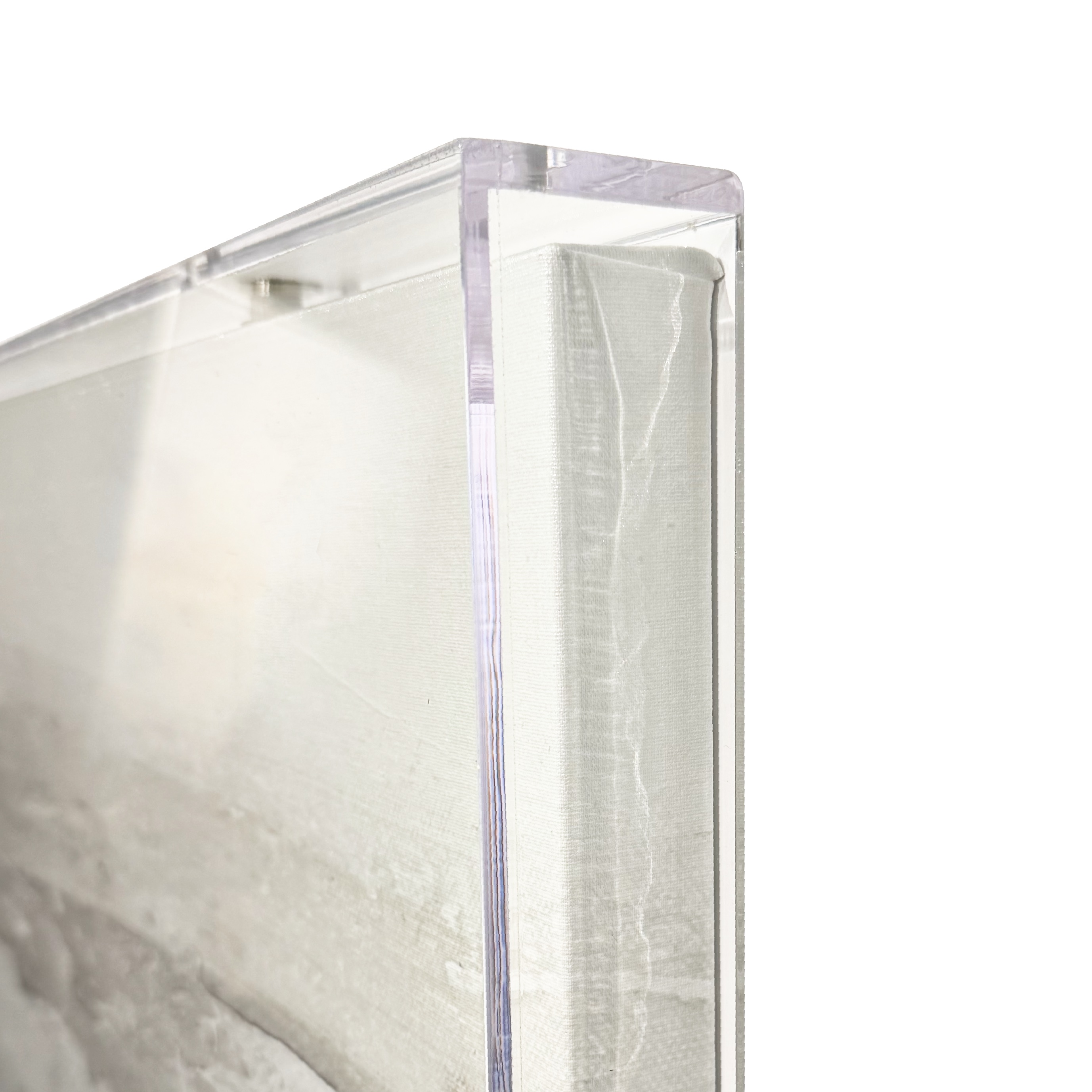 Bands of warm ivory, chalk white, and soft mineral gray stretch across the composition, forming an abstract horizon that feels both expansive and grounded. Subtle tonal shifts and lightly distressed edges create the effect of natural stone worn smooth over time, while the acrylic shadowbox presentation adds a crisp architectural finish that enhances the piece’s clean, modern character.